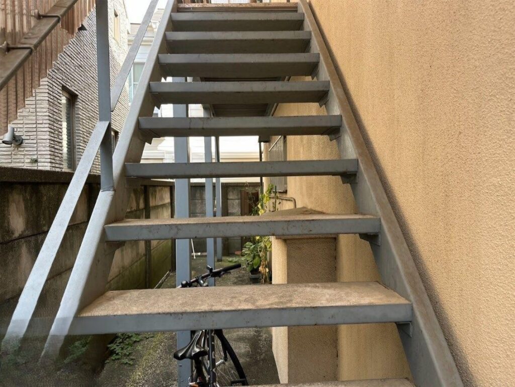 今回は、全体の高圧洗浄から階段部分の下地処理・錆止め塗装までの工程をご紹介します。