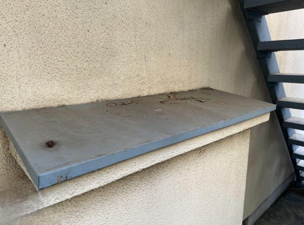 付帯部は、屋外で雨風を受けやすく、特に 換気フード・鉄製天板・共用廊下まわりには細かな錆や旧塗膜の浮きが見られました。