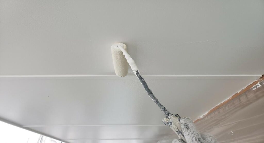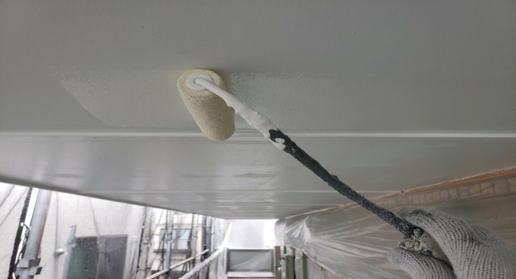 練馬区の集合住宅で、外壁塗装工事にあわせて軒天の上塗り塗装をローラーで施工している様子