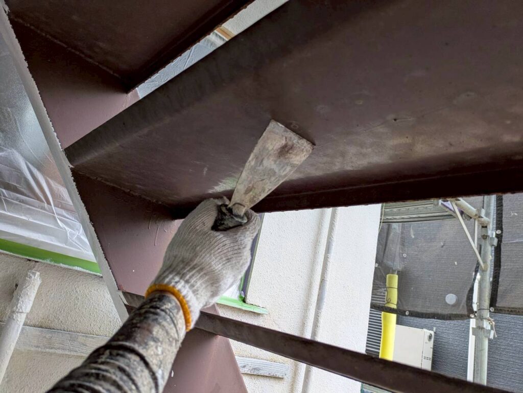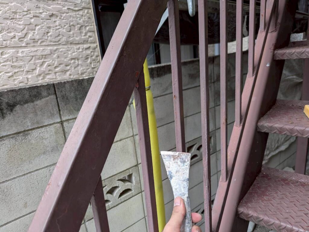 特に、雨水がたまりやすい踏板の隙間や、手すりの支柱部分は念入りなケレンと防錆塗装を行うことで、後々のサビ再発や腐食を防止できます。